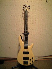 アイバニーズ製の5弦ベース バンドでベースを弾いていたとき、ギタリストが不在でギターソロをベースで弾いていました。 その場合、高い弦があったほうがいいと思い、値段も2万円以下だったので購入しました。 本来は低音側に弦が多いタイプでしたが、ナットを調整して高音側に1弦増やしました。 で、ライブで何度か使いましたが、4弦ベースになれていたので、どうも弾きづらいし アクティブというのも好きじゃありません。 ただ、ネックの状態は僕が所有する中で一番いいので、録音に使っています。 |