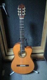 ヤマハのエレガット 音楽仲間の方がヤマハの講師をしているときにもらったそうです。 でも、音が気にいらないし、普段、僕にお世話になっているからと、そのお礼にくれました。 僕は音にはこだわりがないので、これはこれで使えると思っています。 ラインの音だと、イコライジングによってはガットギターらしく聞こえます。 生音は、ボディーが薄くてプラスティックのせいか、マイク録りすると、ウクレレのような音です。 プロ歌手のハワイアンのライブで使いましたが、好評でした。 |