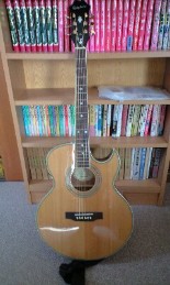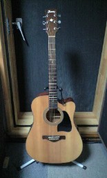 エピフォン タカミネのフレット打ち替えが必要となったのですが、元々1万円で買ったギターです。 フレットの打ち替えには3万円くらいかかるので新品の安いエレアコを買ったほうがいいのではと思い、 通販で24800円で購入。 生音は僕の好みなのですが、ラインの音が生音と全然違い、イコライジングしても好みにならず。 また、電池がボタン式のため長時間のライブが不安です。 色合いはいかにもアコギという感じなので、ボランティア演奏ではもっぱらこのギターを使っています。 でも、後述のアイバニーズを購入したため、ライブも引退させました。 僕は母屋には新品の楽器しか置かないという主義なので、今は母屋で使っております。 |