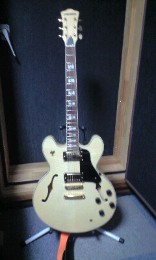 セミアコ(プレイテック製) 2016年7月購入。一応、ES335のコピーモデルなのかな。 一台は欲しいと思っていたのが、これが19800円のとき。買い損ねたら5000円値上がり。 しょうがないので24800円で購入しました。レビューにあるとおり弦高が高すぎて調整不能。 ということでブリッジを5ミリほど削りました。 フレットの仕上げもひどくて、自分で専用工具を使って削りました。 結果的にとても弾きやすいギターになりました。 セミアコらしい箱鳴りもあります。やっぱりフュージョンはこのギターだね(^^) |