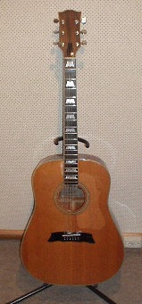 メーカー不明 音楽仲間からいただきました。その方は楽器に詳しくて(元楽器屋さん)、実は とてもいいギターだそうです。僕は楽器の良し悪しがよくわからないのですが、 これはこれで独特な音色でした。見た目もいいし、気に入っています。 |