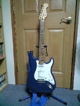 | ブルー・スリー(青いギターが3本という意味です 笑)。以前から所有していたストラトを青に塗り替えました。 | |