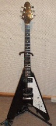 グレコ・フライング・V・モデル 大学時代、キッスをコピーしていた友人からもらいました。いや、一万円で買ったのかな?。 黒く塗って、マイケル・シェンカーモデルのピックガードを付けてサーキットも改造 してあります。 ミニスイッチが3つついており、セレクターも切り替えやすい位置に替えました。 ミニスイッチは、 1、トーンコントロールをフロント、リア、オフに切り替えるもの 2、フロントピックアップをシングル、パラレル、ハムに切り替えるもの。 3、リア・ピックアップをフェイズ・アウトするもの このボディーならではの独特の音が欲しいときに使います。録音では何度も使いました。 |